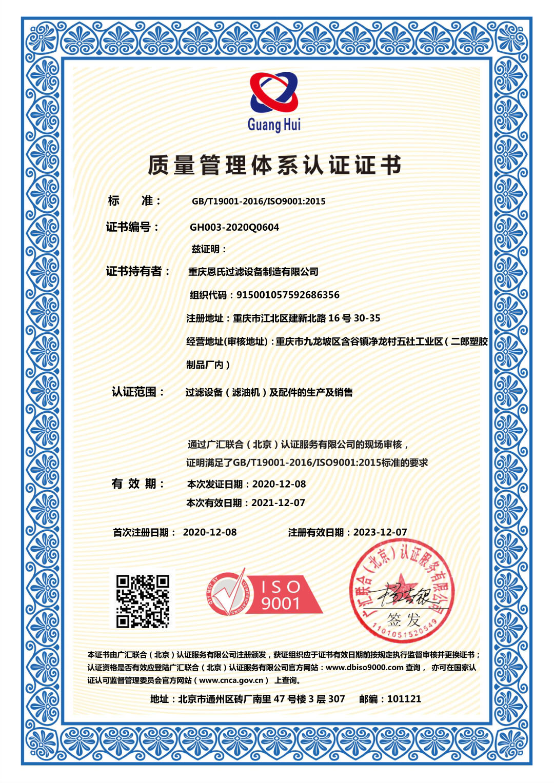 恩氏過濾設(shè)備制造有限公司自1992年以來從事研發(fā),生產(chǎn)潤滑精制設(shè)備的高科技公司。經(jīng)過27年的發(fā)展,NSH已通過了ISO 9001:2020質(zhì)量體系認(rèn)證,GB / T 19001-201 6 / ISO 9001:2015環(huán)境管理體系認(rèn)證,中國高新技術(shù)企業(yè)以及中國頒發(fā)的另一類認(rèn)證政府,同時,我們的先進(jìn)技術(shù)已獲得數(shù)百項(xiàng)專利。